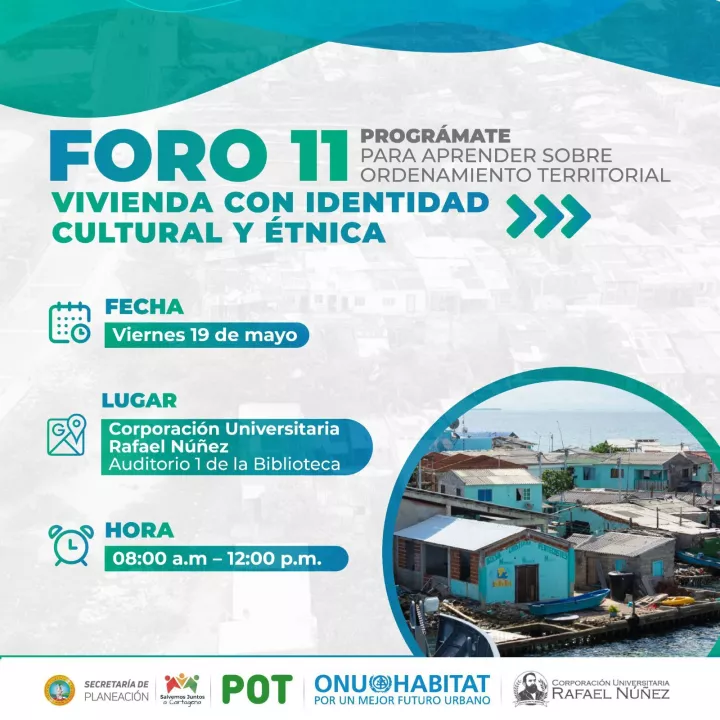 Cartagena de Indias D. T. y C; 18 de mayo de 2023. Este 19 de mayo se realizará el Foro “Vivienda con Identidad Cultural y Étnica”, en el marco del Seminario del Plan de Ordenamiento Territorial. Este evento académico, liderado por la Secretaría de Planeación Distrital en colaboración con ONU-Hábitat, se desarrollará en la Universidad Rafael Núñez, Auditorio 1 de la Biblioteca.