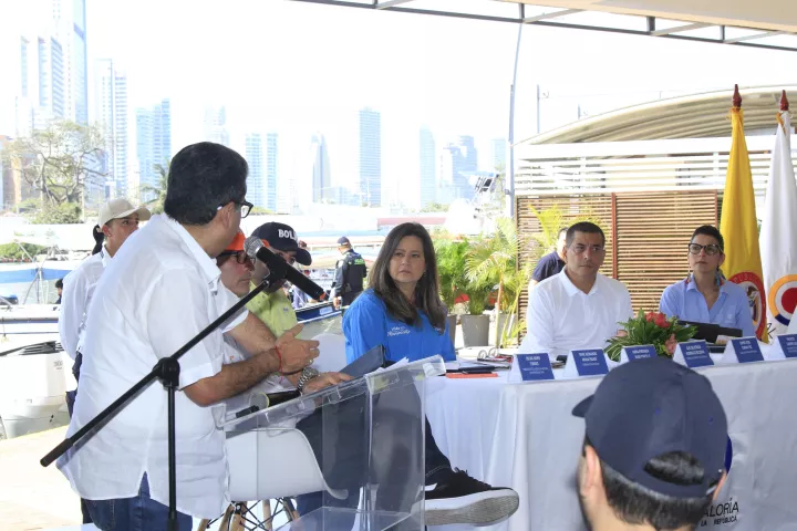Cartagena de Indias D. T. y C., 24 de abril de 2025. La Contraloría General de la República, el Ministerio de Medio Ambiente, Ministerio de Transporte, la Alcaldía de Cartagena de Indias y la Gobernacion de Bolivar hicieron un recorrido fluvial por la desembocadura del Canal del Dique, y así inspeccionar los trabajos de dragado del sedimento y recalcaron la importancia del inicio de las obras en el Canal del Dique.