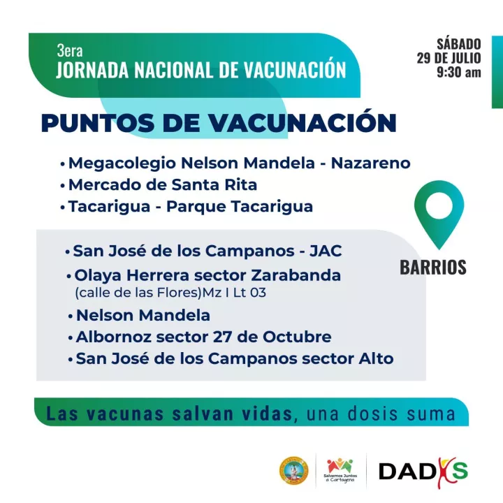 Cartagena de Indias D. T. y C; 27 de julio de 2023. El Departamento Administrativo Distrital de Salud -DADIS- invita a todos los cartageneros y comunidad en general a participar de la Tercera Jornada Nacional de Vacunación que se realizará el sábado 29 de julio, la cual iniciará a las 9:30 a.m. y se extenderá hasta las 4:00 p.m.