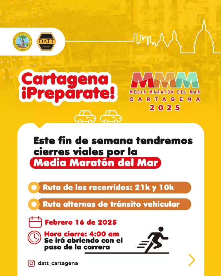 DATT anuncia desvíos y restricciones viales por la Media Maratón del Mar en Cartagena este 16 de febrero