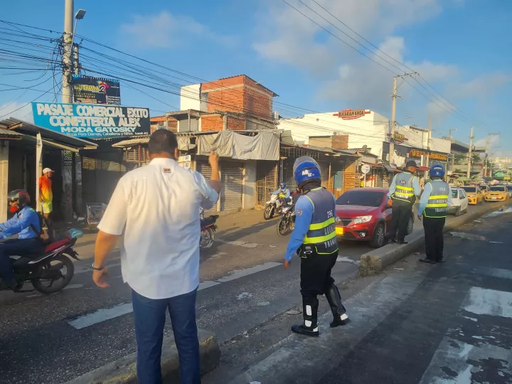 En el Mercado de Bazurto, desde muy temprano, agentes y reguladores de tránsito hacen orientación del tráfico, control de seguridad vial en el solobús de Transcaribe, despeje de la vía, en especial de los conductores de camiones de transporte de alimentos y de ventas estacionarias, para que no se estacionen en la vía.