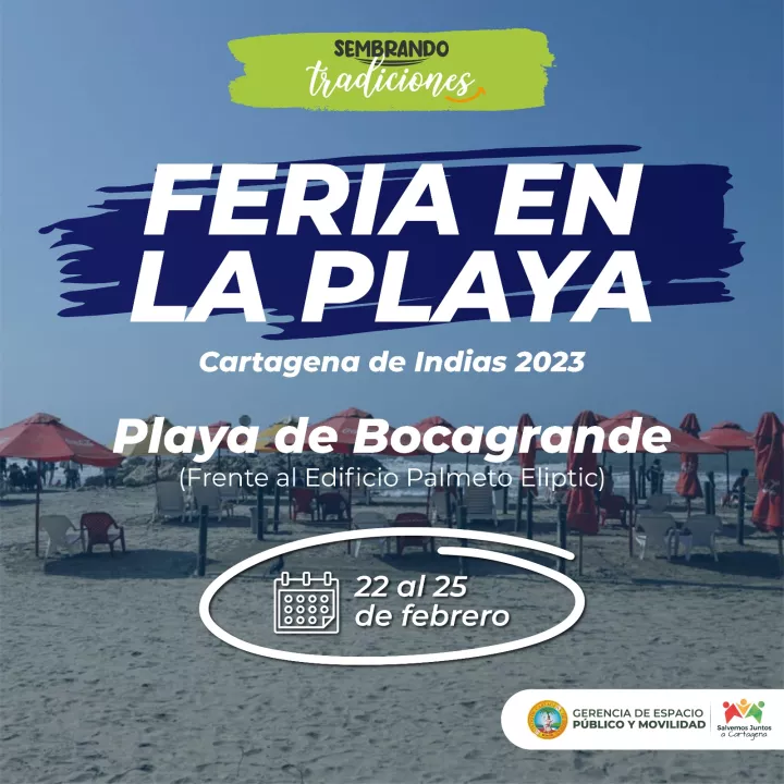 Cartagena de Indias D. T. y C., 21 de febrero de 2023. La Gerencia de Espacio Público y Movilidad realizará, junto a la Cooperativa de Mercancías Varias de Cartagena (Coomervarcar), la Feria en la Playa a partir de mañana 22 hasta el 25 de febrero en una playa de Bocagrande, ubicada al frente del edificio Palmetto Elíptic, en el horario de 10:00 de la mañana hasta las 5:00 de la tarde.