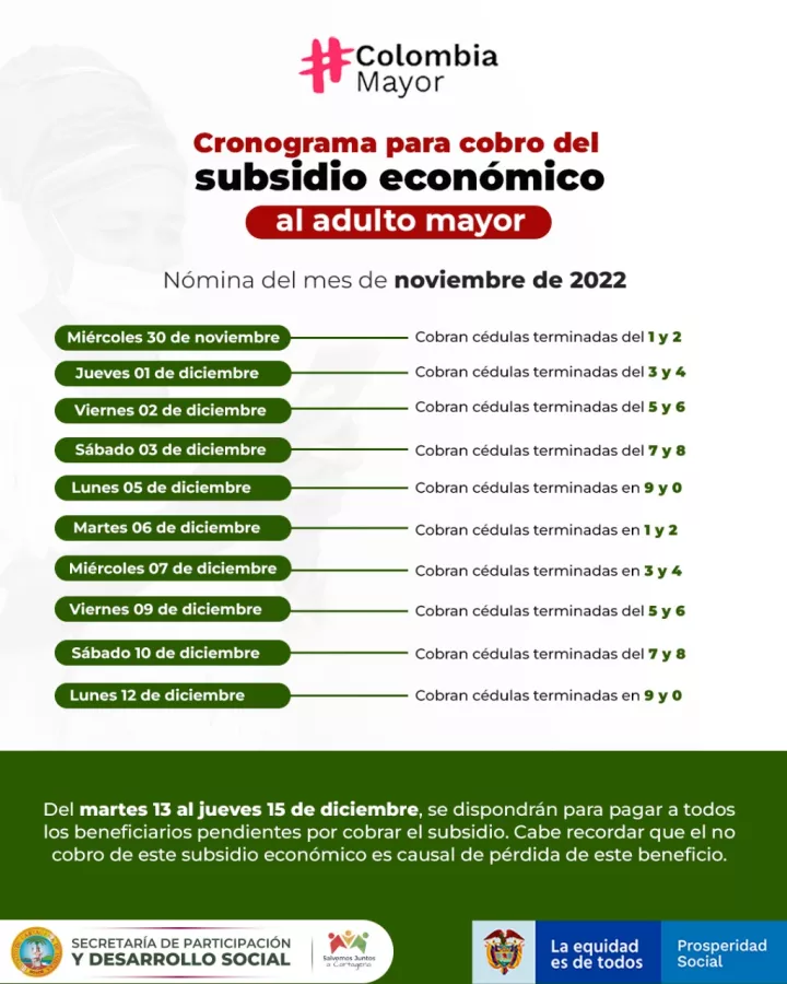 Cartagena de Indias D. T. y C., 30 de noviembre de 2022. La Secretaría de Participación y Desarrollo Social informa a toda la ciudadanía que desde hoy, miércoles 30 de noviembre, hasta el 15 de diciembre, los beneficiarios del programa del gobierno nacional Colombia Mayor podrán cobrar su subsidio económico correspondiente a la nómina de noviembre.