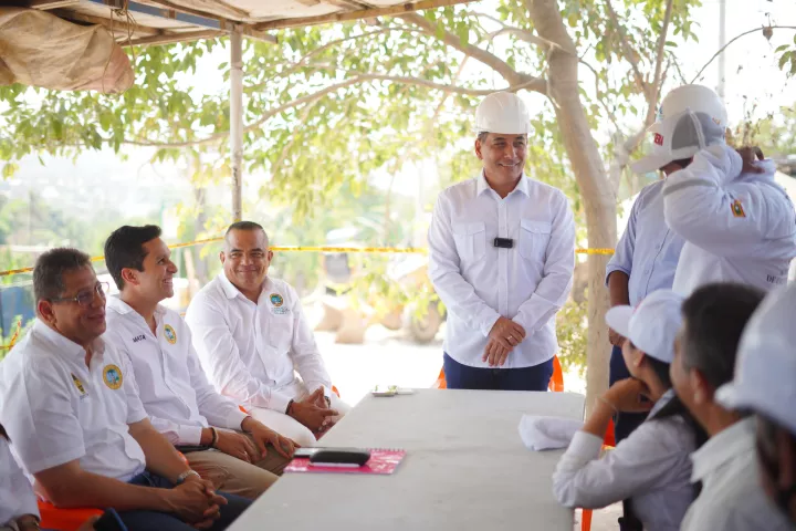 Cartagena de Indias D. T. y C., 11 de marzo de 2024. Al término de reunión sostenida en el Puesto de Mando Unificado, PMU, en el barrio Cerros de Albornoz, sector La Paz, el alcalde mayor de Cartagena, Dumek Turbay Paz, entregó un parte de tranquilidad a la ciudadanía, frente a los trabajos de reparación de una tubería, identificados durante el fin de semana.