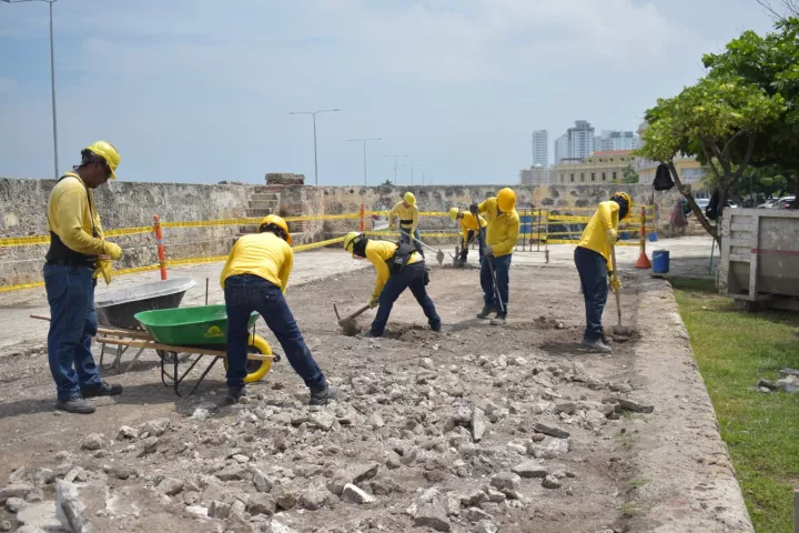 El arquitecto restaurador, Mario Zapateiro Altamiranda, director de Obras de la Etcar, explicó: “usualmente desde la Etcar refaccionamos los soldados, sin embargo, en este caso estamos haciendo un cambio, ya que estamos removiendo el material deteriorado en su totalidad, para reemplazarlo con una mezcla de materiales similares que le den la consistencia y homogeneidad necesaria a las pendientes, que están divididas por pirlanes, en un área de 806 metros cuadrados, de manera que se rectifique el nivel y pueda haber un desagüe natural hacia el extremo sur”.