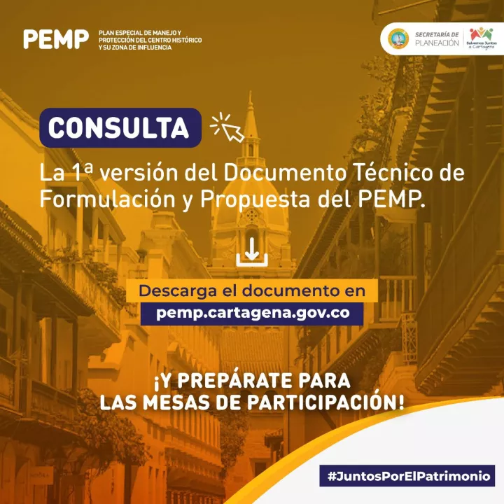 La Secretaría de Planeación Distrital publicó la primera versión del Documento Técnico de Formulación y Propuesta del Plan Especial de Manejo y Protección del Centro Histórico y su Zona de Influencia, el cual se encuentra disponible en la página web pemp.cartagena.gov.co.