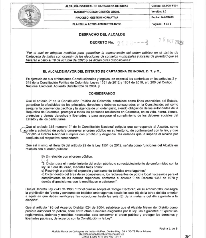 Con motivo de las elecciones de los Consejos Municipales y Locales de Juventud, la Alcaldía Mayor de Cartagena decretó ley seca desde las 6:00 p.m. del sábado 18 de octubre hasta las 6:00 a.m. del lunes 20 de octubre, en todo el territorio distrital. La medida busca garantizar la tranquilidad, seguridad y el normal desarrollo de la jornada electoral.