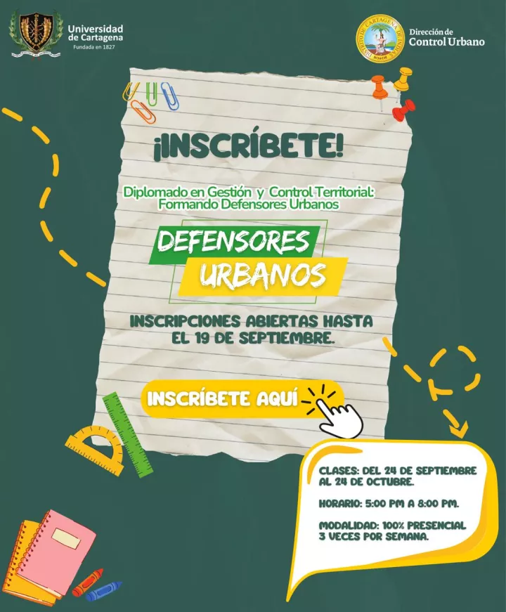 El diplomado tendrá una duración de (1) mes, de manera presencial, (3) días por semana. Las inscripciones están abiertas desde el 17 hasta el 19 de septiembre de 2024, y los interesados pueden obtener más información o inscribirse a través del micrositio web https://www.cartagena.gov.co/direccion-administrativa-control-urbano