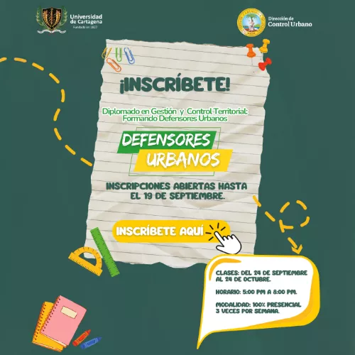 El diplomado tendrá una duración de (1) mes, de manera presencial, (3) días por semana. Las inscripciones están abiertas desde el 17 hasta el 19 de septiembre de 2024, y los interesados pueden obtener más información o inscribirse a través del micrositio web https://www.cartagena.gov.co/direccion-administrativa-control-urbano