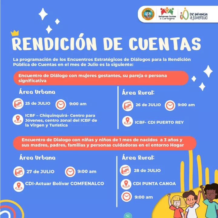 Cartagena de Indias D.T y C; 19 de julio 2023. La Secretaría de Planeación y la Secretaría de Participación y Desarrollo Social de Cartagena, próximamente, tal como lo establece la Procuraduría General de la Nación, para el proceso de Rendición Pública de Cuentas Territorial Especial sobre los derechos de la Infancia, la Adolescencia y la Juventud 2020- 2023; darán inicio a los encuentros Estratégicos de Diálogos con los actores del proceso de la Política Pública de Primera Infancia, Infancia y Adolescencia.