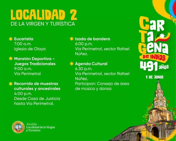 El alcalde de la Localidad 2, Alexis Valerio, manifestó: ”Desde la Alcaldía Local de la Virgen y Turística los invitamos a celebrar juntos el cumpleaños de nuestra amada ciudad. Habrá artistas locales, grupos folclóricos, danzas modernas, muestras culturales y un festival de la cartagenidad. Nuestro punto de encuentro será en la vía Perimetral, sectores Foco Rojo y Rafael Núñez. ¡Los esperamos!”.
