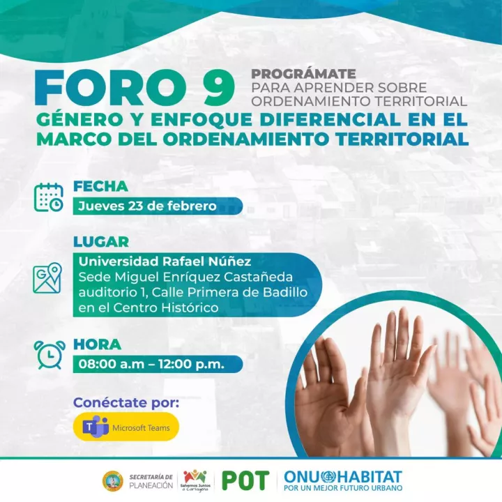 Cartagena de Indias D. T. y C; 21 de febrero de 2023. El próximo 23 de febrero se realizará el Foro 9 “Género y Enfoque Diferencial en el Marco del Ordenamiento Territorial”, evento que hace parte de la agenda académica del Plan de Ordenamiento Territorial - POT, y se desarrolla desde la Secretaría de Planeación Distrital, en alianza con ONU-Habitat. En esta oportunidad las conferencias se realizarán en la modalidad presencial, en la Universidad Rafael Núñez - sede Miguel Enrique Castañeda en el auditorio 1, a partir de las 8:00 a.m.