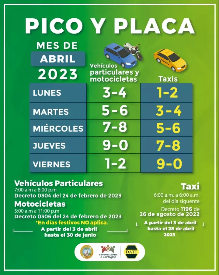 Cartagena de Indias D. T. y C; 31 de marzo de 2023. El próximo lunes 3 de abril de 2023 comienza una nueva rotación de pico y placa para motocicletas y vehículos particulares y taxis.