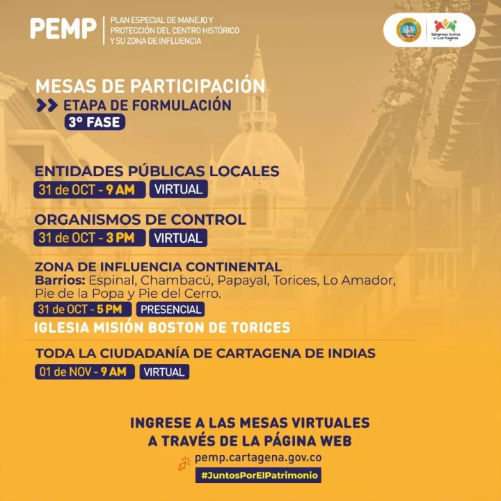 Cartagena de Indias D. T. y C., 31 de octubre de 2022. El PEMP inició un nuevo ciclo de participación hoy, 31 de octubre, con la instalación de mesas de trabajo con las comunidades del Centro Histórico y su zona de influencia. En estos espacios se presenta a la ciudadanía los avances en la formulación del instrumento. El cronograma inicia con dos mesas virtuales y una presencial en el barrio Torices.