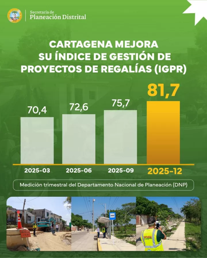 Cartagena de Indias, D. T. y C., 21 de marzo de 2025.La gestión de los recursos de regalías en Cartagena continúa mostrando resultados positivos. La Alcaldía de Cartagena, a través de la Secretaría de Planeación Distrital, destacó los resultados de la más reciente medición del Índice de Gestión de Proyectos de Regalías (IGPR), realizada por el Departamento Nacional de Planeación (DNP), en la que el Distrito alcanzó un puntaje de 81,7 durante el trimestre octubre–diciembre de 2025.
