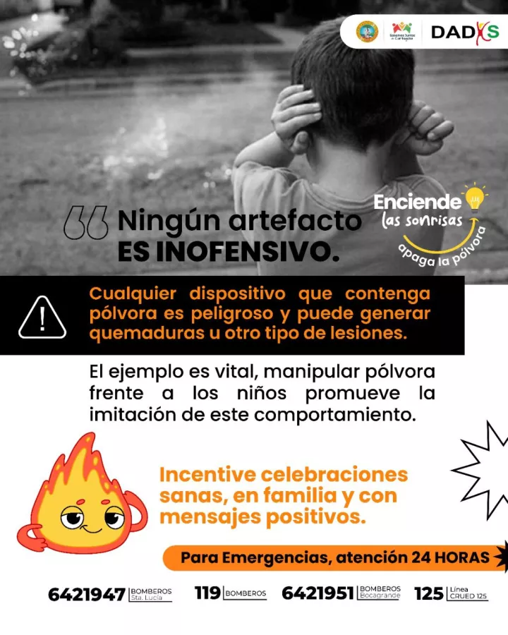 Cartagena de Indias D. T. y C., 23 de diciembre de 2022 Este fin de semana, miles de familias celebrarán la Navidad, y desde la Alcaldía de Cartahena se recomienda que el disfrute sea tranquilo y seguro, para no tener hechos que lamentar antes de finalizar el año. Es por eso que en el marco de la campaña “Enciende la sonrisa, apaga la pólvora”, la administración recomienda a las personas que dejen en manos de los expertos la pólvora pirotécnica y, de la misma manera, velar por la vida y salud de los menores de edad para evitar que manipulen cualquier tipo de artefacto explosivo.
