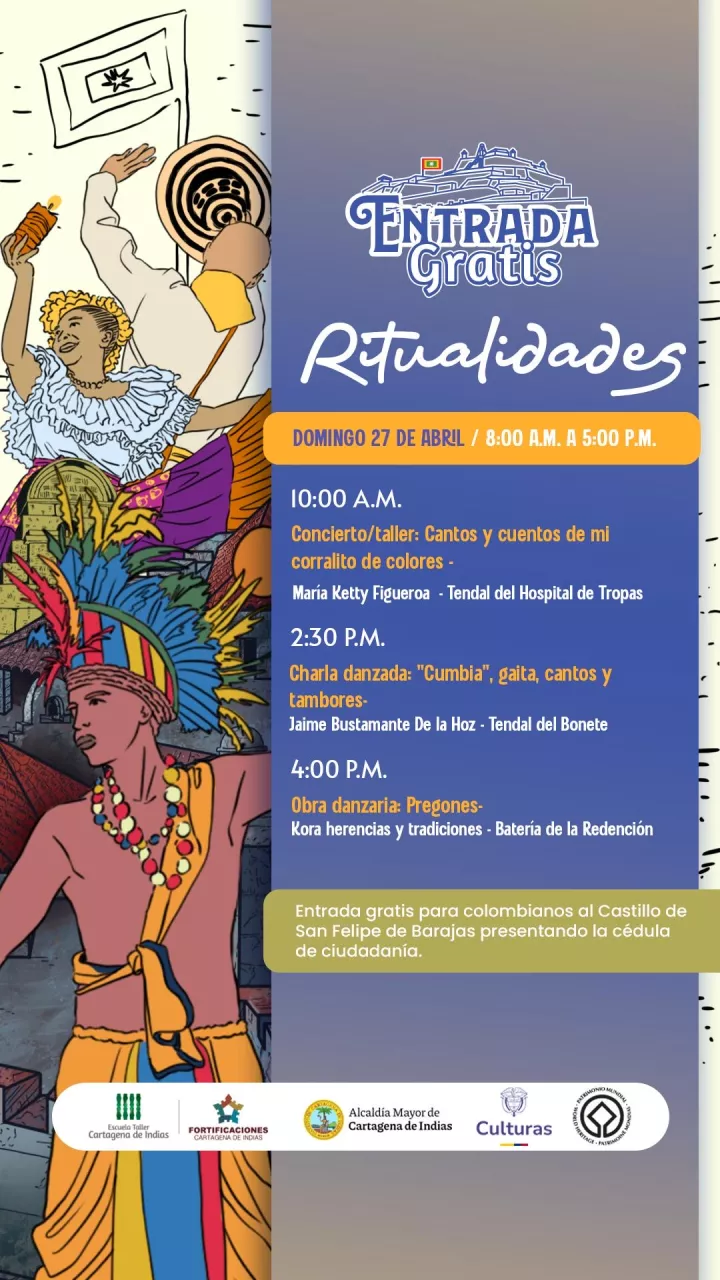 Como es habitual en los días de acceso gratuito a esta fortaleza, que va desde las 8:00 a.m. hasta las 5:00 p.m., la Etcar tiene preparada una agenda artística y cultural que en esta ocasión está enmarcada en las ritualidades propias de la identidad cartagenera, teniendo en cuenta que recientemente se vivieron las tradiciones religiosas de la Semana Santa en Cartagena de Indias.