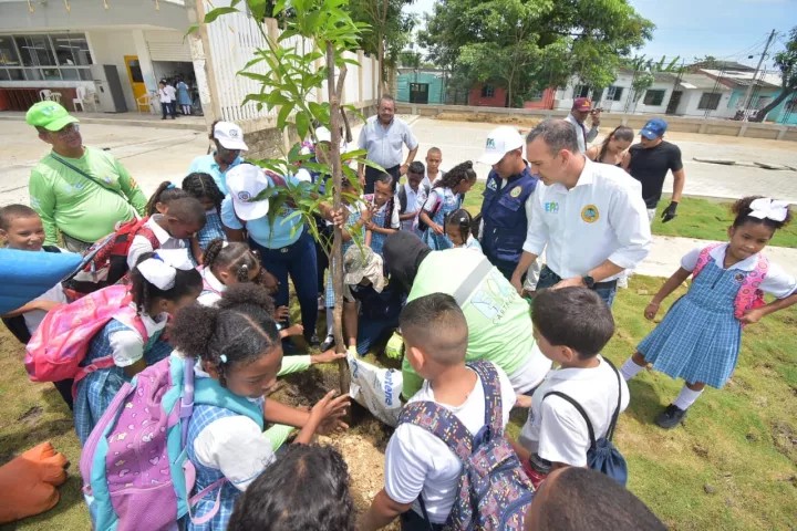 Además de jornadas de recuperación de entornos y zonas verdes, tanto en los alrededores como internas realizadas desde inicio del 2024, el EPA Cartagena regala ahora a la nueva sede escolar la siembra de 50 nuevos árboles, por lo que la institución mejora aún más su entorno verde y se cumple con compromisos adquiridos bajo la administración del alcalde Dumek Turbay Paz.