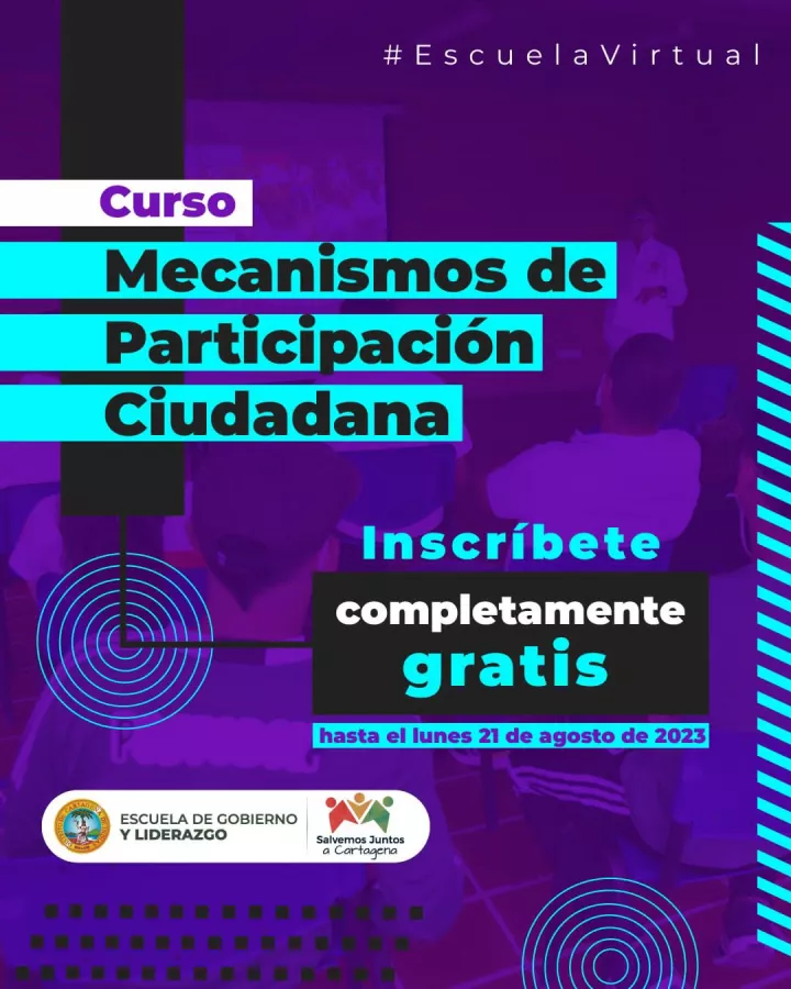 Cartagena de Indias D. T. y C; 18 de agosto 2023. La Escuela de Gobierno y Liderazgo de la Alcaldía de Cartagena abre inscripción al curso de Mecanismos de Participación Ciudadana, dirigido a la comunidad cartagenera mayor de 18 años.