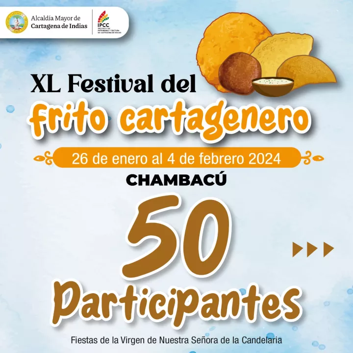 Cartagena de Indias D.T. y C., 22 de enero del 2024. La Alcaldía Mayor, a través del Instituto de Patrimonio y Cultura de Cartagena (IPCC), dio a conocer los nombres de los 50 participantes de la versión XL del Festival del Frito Cartagenero 2024, que este año va del 26 de enero al 04 de febrero; celebración adjunta a las Fiestas de Nuestra Señora de la Candelaria.
