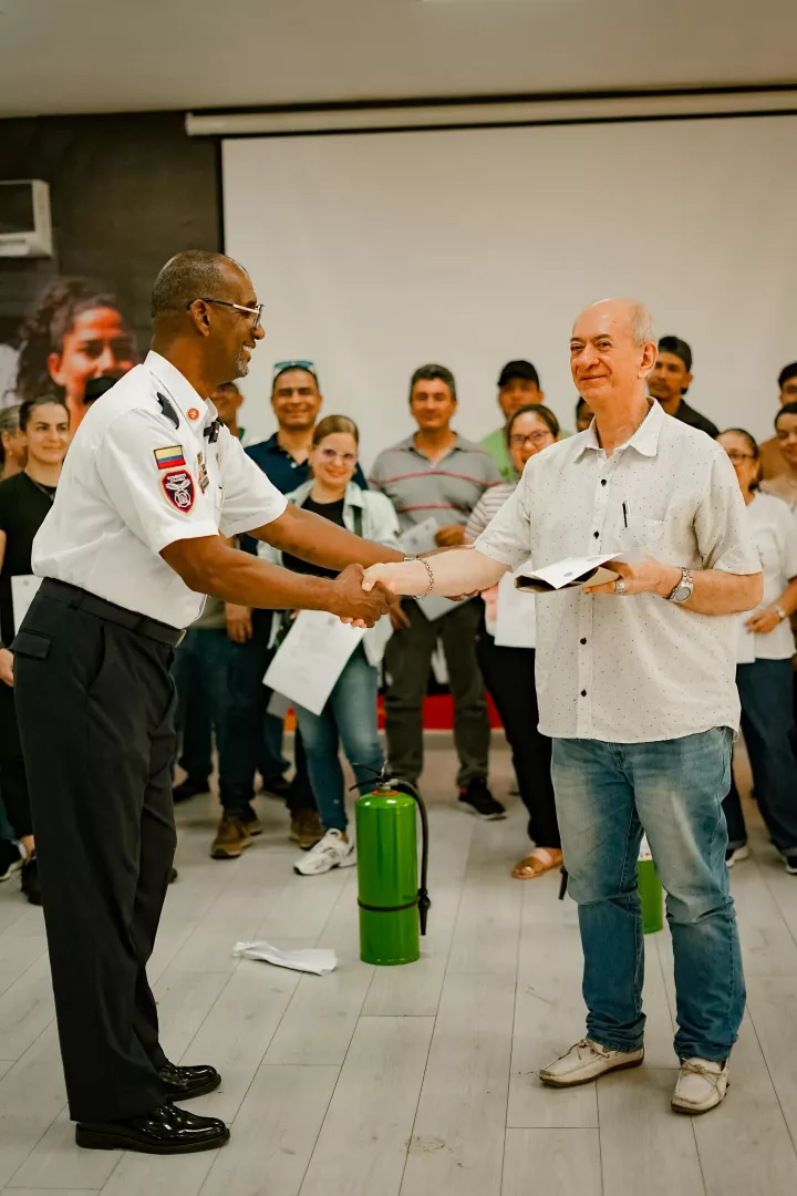 La capacitación fue liderada por el teniente Franklin Hamilton Velásquez, quien orientó a los asistentes sobre la normativa actual en seguridad contra incendios, el uso adecuado de extintores, el manejo seguro de conexiones eléctricas y las acciones clave para actuar de manera oportuna ante una emergencia.