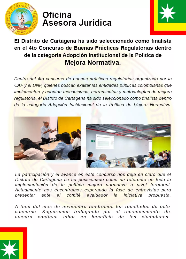 El Distrito de Cartagena ha sido seleccionado como finalista en el 4to Concurso de Buenas Prácticas Regulatorias dentro de la categoría Adopción Institucional de la Política de Mejora Normativa.