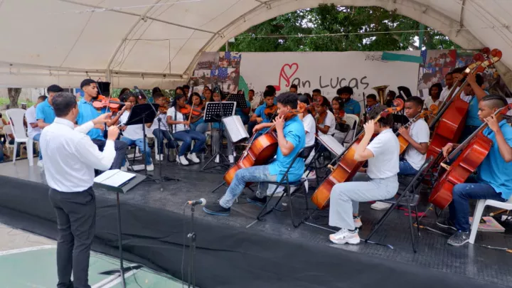 Los intérpretes encargados de deleitar al público asistente, que se congregó comenzada la tarde en la cancha deportiva del plantel educativo, fueron los estudiantes de la Orquesta Filarmónica Infantil-Juvenil de la I.E. San Lucas, protagonistas de un proyecto artístico y musical sembrdo sobre las bases que emana la paz, desde hace cinco años.