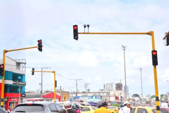 Cartagena de Indias, D. T. y C., 7 de febrero de 2024.- La red semafórica de la Glorieta de Bazurto ya se encuentra al servicio nuevamente, después de estar apagada a causa de un acto de vandalismo en su cableado.