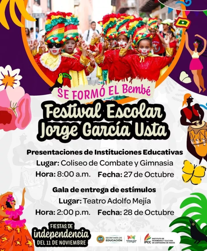 Hoy jueves se realizará el Festival Escolar de música y danza ‘Jorge García Usta’, un acontecimiento cultural inigualable, organizado por la Secretaría de Educación del Distrito, en la que se mostrará la diversidad étnica y folclórica de nuestra región Caribe y en el marco de los eventos que contempla la agenda de conmemoración de las Fiestas de la Independencia del 11 de Noviembre, liderada por el Instituto de Patrimonio y Cultura.