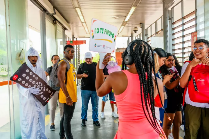 En medio de los performance, también se invita a los usuarios a evitar el arrojo de basuras en las estaciones de Transcaribe, proyectando mensajes que orienten a la ciudadanía.