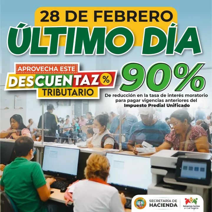 Cartagena de Indias D. T y C; 28 de febrero de 2023. Hoy, martes 28 de febrero, finaliza el incentivo tributario del 90% de descuento en la tasa de interés moratorio, para ponerse al día con las vigencias anteriores del Impuesto Predial Unificado. La invitación de la Secretaría de Hacienda es a aprovechar el estímulo hasta el último minuto.