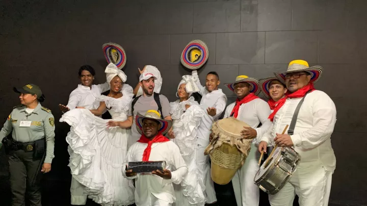 El influenciador llegó a la ciudad la tarde de hoy, donde fue recibido con música y danza, a cargo del Instituto de Patrimonio y Cultura de Cartagena. Además, recibió dulces tradicionales y un cuadro pintado a mano.