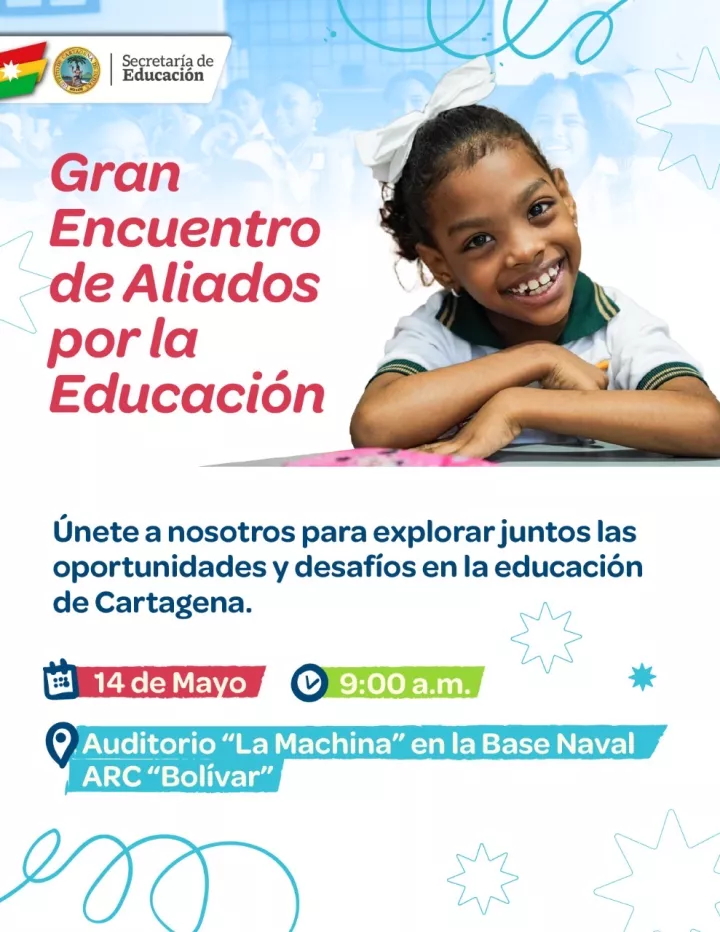 El martes 14 de mayo dará inicio la Semana de la Educación con el "Primer Gran Encuentro de Aliados por la Educación", que se realizará en el auditorio La Machina, en la Base Naval ARC del barrio Bocagrande. Este evento reunirá a diversos actores como empresas privadas, universidades, fundaciones, medios de comunicación, etc; para compartir ideas y establecer alianzas en pro de la calidad educativa en Cartagena.