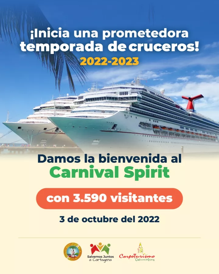 Cartagena de Indias D.T y C., 03 de octubre de 2022. Con la llegada al Puerto de Cartagena del Carnival Spirit y sus más de 3 mil cruceristas a bordo, Cartagena inicia oficialmente la temporada de cruceros 2022 - 2023.