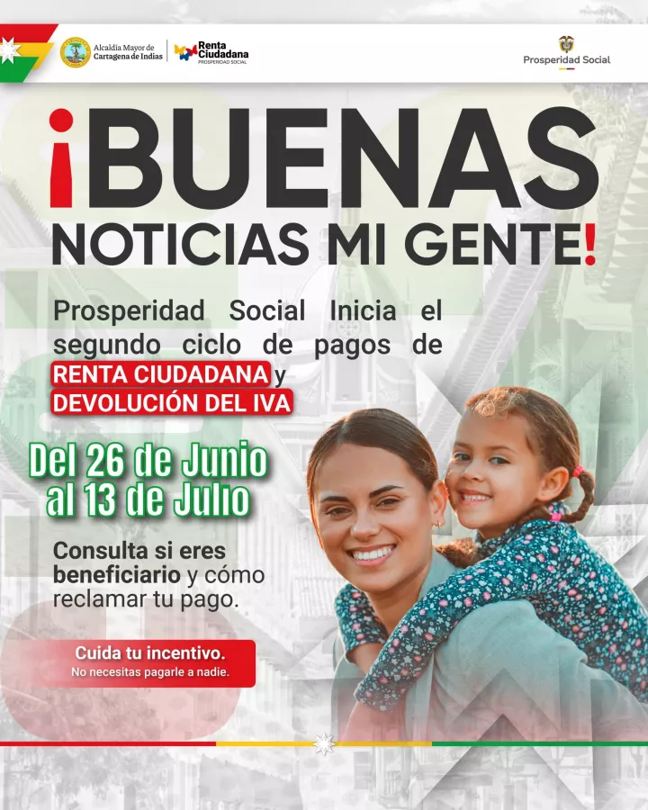 Cartagena de Indias, D.T. y C., 25 de junio de 2025. La Alcaldía Mayor de Cartagena informa a la comunidad que Prosperidad Social realizará el segundo ciclo de pagos de los programas Renta Ciudadana y Devolución del IVA, entre el 26 de junio y el 13 de julio, para bancarizados y modalidad de giro. El Banco Agrario será el encargado de la distribución de los recursos.