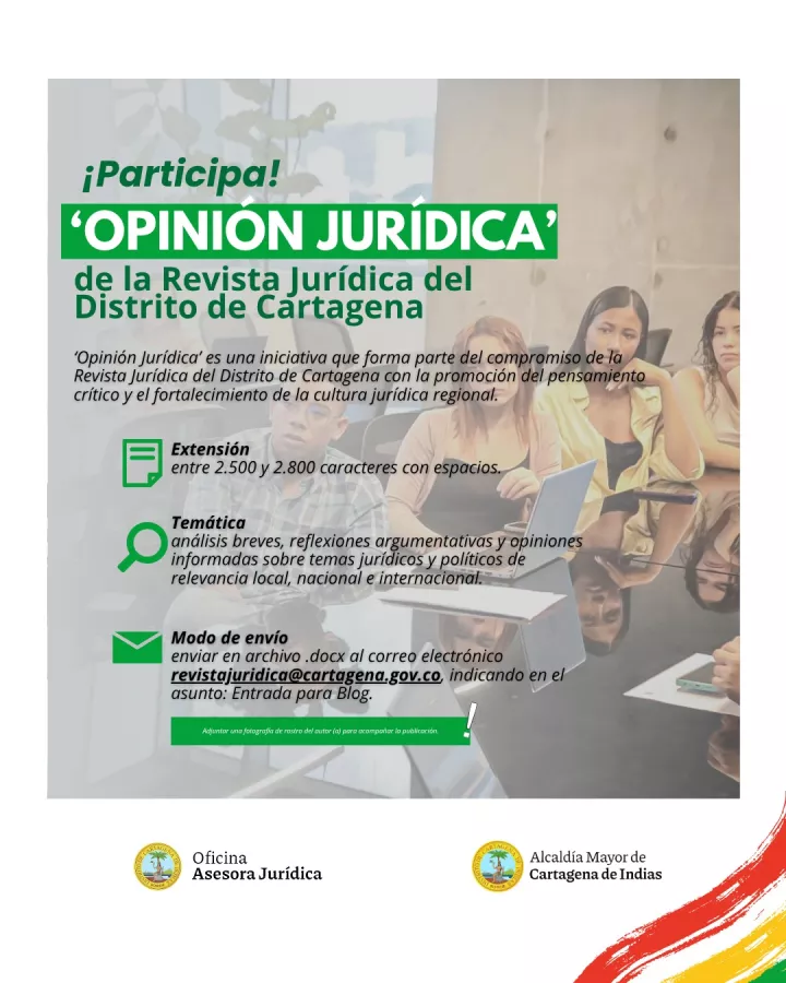 La Revista Jurídica del Distrito de Cartagena de Indias invita a toda la comunidad jurídica y académica —incluyendo docentes, investigadores, litigantes, jueces, estudiantes y funcionarios públicos— a participar activamente en su Blog Jurídico , un nuevo espacio e divulgación de análisis breves, reflexiones argumentativas y opiniones informadas sobre temas jurídicos de relevancia local, nacional e internacional.