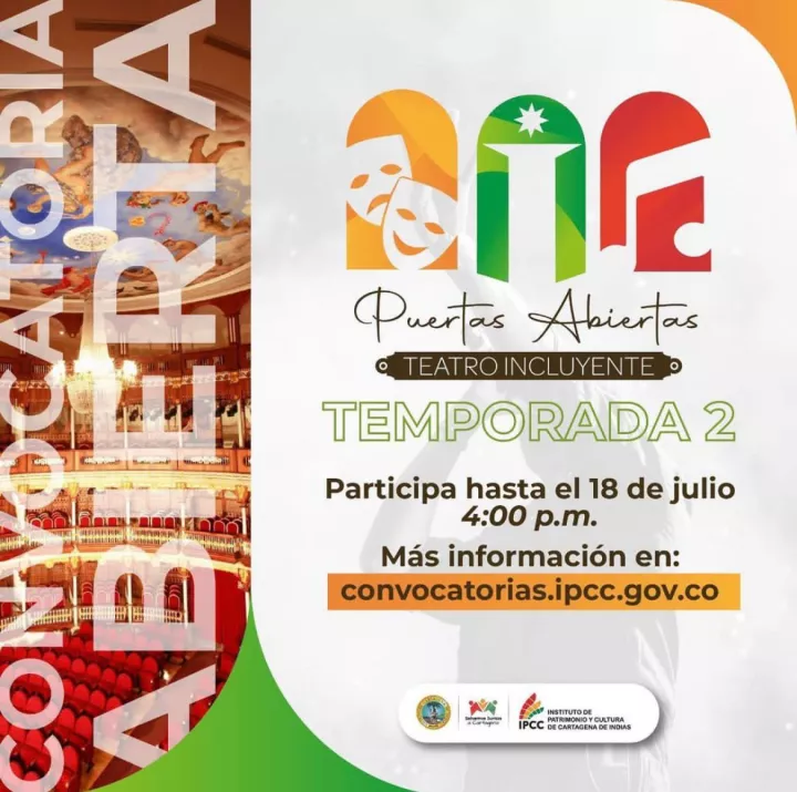 Cartagena de Indias D. T. y C; 29 de junio de 2023. El Instituto de Patrimonio y Cultura de Cartagena (IPCC) abrió la convocatoria “Puertas abiertas al teatro incluyente 2023”, para la circulación de artistas en el Teatro Adolfo Mejía (TAM) con ocasión al desarrollo de una agenda artística para el goce y disfrute cultural de la ciudadanía cartagenera.