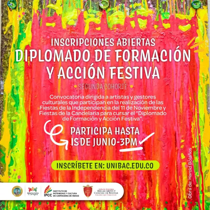 Cartagena de Indias D. T. y C; 13 de junio de 2023. Con el fin de vincular a la mayor cantidad de gestores culturales, artistas, actores festivos y hacedores de las Fiestas de Independencia del 11 de Noviembre, El Instituto de Patrimonio y Cultura de Cartagena (IPCC) y la Institución Universitaria de Bellas Artes y Ciencias de Bolívar (UNIBAC) ampliaron el plazo para la inscripción en el diplomado de Formación y Acción Festiva hasta el jueves 15 de junio.