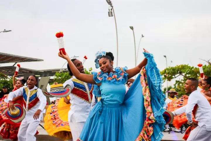 Cartagena de Indias D. T. y C., 13 de julio de 2025. La Corporación Cultural Kymbalá, uno de los grupos ganadores de la convocatoria ‘Cartagena, Ciudad de Derechos’ en la modalidad de circulación nacional, se presentó en el Carnaval de Verano de Barranquilla. El pasado sábado 12 de julio, en el Malecón del Río, presentaron “Reminiscencias del Folclor”, una obra que fusiona la tradición local con lenguajes contemporáneos, creada por jóvenes artistas de los barrios aledaños a las faldas de La Popa.