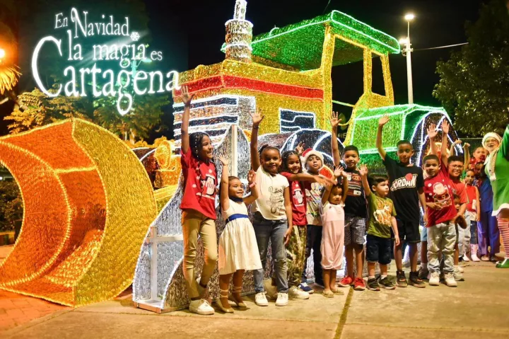 Cartagena de Indias D. T y C., 8 de diciembre del 2022. La comunidad del barrio El Country disfruta del encendido del alumbrado navideño instalado en el barrio, el cual recibe a niños y adultos que visitan el parque para admirar la figura navideña, que hace parte de 38 puntos distribuidos en la ciudad. Las figuras fueron tejidas por más de 100 mujeres cartageneras cabezas de hogar.