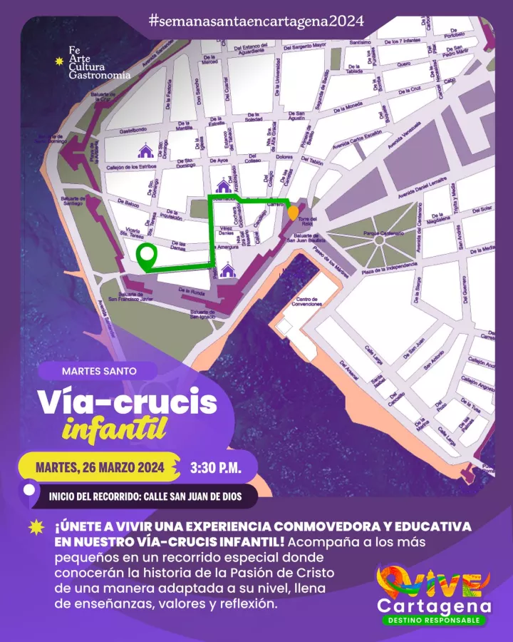 El Viacrucis iniciará a las 3:30 p.m. Sale del Museo Naval, sigue por la calle San Juan de Dios y la iglesia de San Pedro Claver; continúa hacia el Parque Bolívar, donde seguirá por la Plaza de la Proclamación hacia la Plaza de Los Coches, donde concluye, para dar paso a un espacio de cine infantil, en el marco de Vive tu Plaza.
