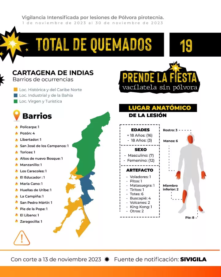 Cartagena de Indias D.T y C; 13 de noviembre de 2023 A pesar de los que esfuerzos por generar conciencia en la comunidad, a través de diferentes medios de comunicación, redes sociales, instituciones educativas, entre otros, para evitar casos de quemados por pólvora durante las Fiestas de Independencia del 11 de Noviembre, el Departamento Administrativo Distrital de Salud -DADIS- reportó, a través de la Dirección Operativa de Vigilancia en Salud, 19 quedamos por pólvora a corte del 12 de noviembre. Las cifras de quemados aumentaron en un 35,71% en comparación al mismo período de fiestas del año 2022.