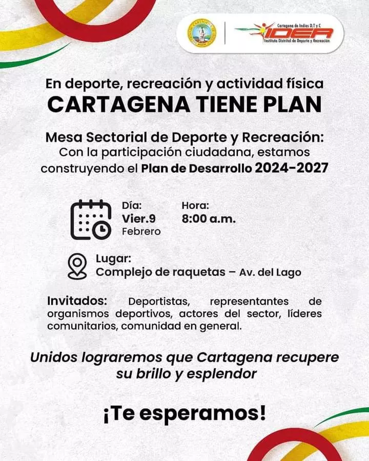 Cartagena de Indias, febrero 08 del 2024. En cumplimiento del proceso de participación ciudadana para la construcción del Plan de Desarrollo del Distrito 2024 – 2027, se cumplirá este viernes 09 de febrero, la primera mesa sectorial de deporte y recreación.