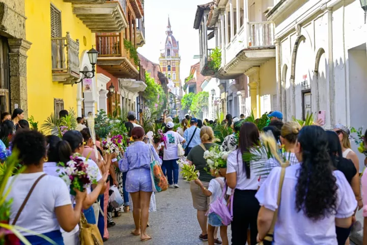 La celebración comenzó en la Plaza de la Merced, donde el color de los ramos (sustituidos este año mayoritariamente por plantas vivas en un gesto de conciencia ambiental) llenó de vida los alrededores del Teatro Adolfo Mejía. Desde allí, la multitud inició la procesión hacia la Catedral de Santa Catalina de Alejandría, transitando por la emblemática Carrera 4, reconocida internacionalmente como una de las calles más bellas de Colombia y del mundo.