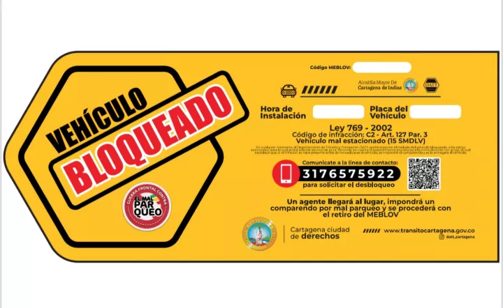 El adhesivo del DATT es amarillo, con letras negras y rojo, y dice BLOQUEADO, tiene el logo oficial de la Alcaldía de Cartagena y del DATT, cita el Código Nacional de Tránsito y la infracción de mal parqueo; además tiene el número de celular de contacto para el desbloqueo, y el código QR que indica el procedimiento a seguir.