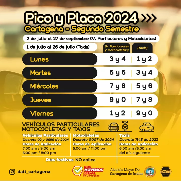 Cartagena de Indias, D. T. y C., 28 de junio de 2024.- A partir del martes 2 de julio comienza un nuevo ciclo de pico y placa para motocicletas y vehículos particulares en la ciudad.