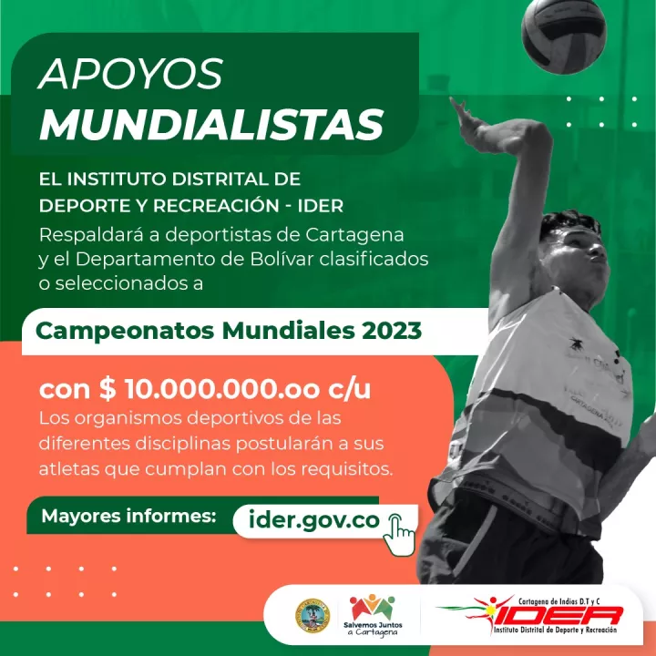 Cartagena de Indias D.T. y C; 12 de agosto de 2023. Los atletas de alto rendimiento, categorías mayores, adscritos a clubes deportivos del Distrito de Cartagena y que estén seleccionados o clasificados para participar en competencias mundialistas antes de terminar el presente año, contarán con respaldos económicos del instituto de Deporte y Recreación -IDER.