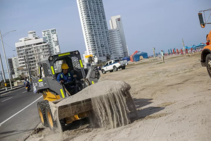 Cartagena de Indias D. T. y C., 26 de febrero de 2024. La Oficina Asesora para la Gestión del Riesgo del Desastre de Cartagena (OAGRD) continúa su firme compromiso con la reducción del riesgo en el territorio. Bajo la dirección del alcalde mayor de Cartagena, Dumek Turbay, ha emprendido una labor integral destinada a la recuperación y limpieza de la avenida Santander, situada en los alrededores de las playas de Marbella. Este esfuerzo responde a la acumulación de arena y residuos sólidos causada por el impacto del mar de leva y los vientos intensos en la zona.