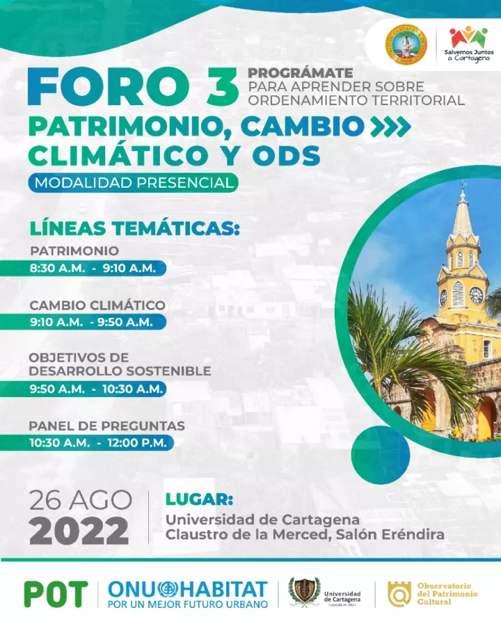 El 26 de agosto se realizará el tercer Foro del Seminario del Plan de Ordenamiento Territorial, el cual se denomina “Patrimonio, Cambio Climático y ODS”, en la Universidad de Cartagena (Claustro de la Merced- Salón Eréndira), desde las 8:00 a.m., con auditorio abierto al público, hasta completar aforo.