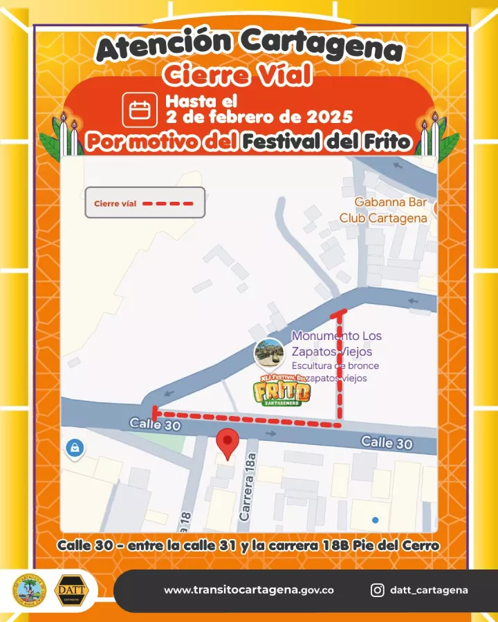 Cartagena de Indias, D. T. y C., 23 de enero de 2025 - El Festival del Frito Cartagenero se vine con todo este fin de semana y el Departamento Administrativo de Tránsito y Transporte – DATT realizará el cierre vial de una calzada de la calle 30, sobre el Pie del Cerro, para el montaje y la instalación logística de este evento que exhibirá todo el sabor cultural y gastronómico de nuestras matronas.